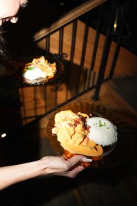 Varmrätt: Svävande Jacobsson med brynt paneerost, vitlöksstekt svamp, tomatsås, ris och grönsaker